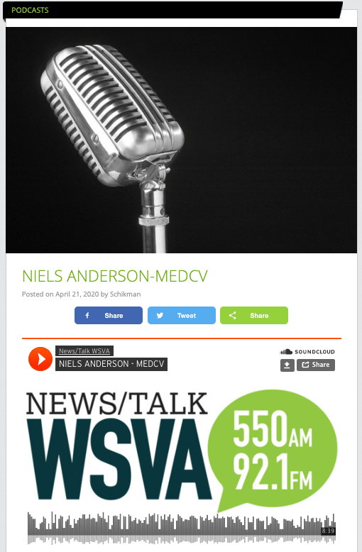 In the last 3 weeks, MedCV Founder, Niels Andersen has been interviewed on the radio in 7 US markets with the most recent in Harrisonburg VA with WSVA on the Mike Schikman Show on April 21st.